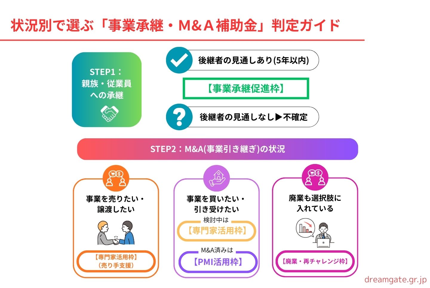 ドリームゲートでは、事業承継・M&Aに精通した専門家への無料相談窓口を設けています。「どの枠が使えるかわからない」「事業計画書を一緒に作りたい」という段階からサポートが可能です。
