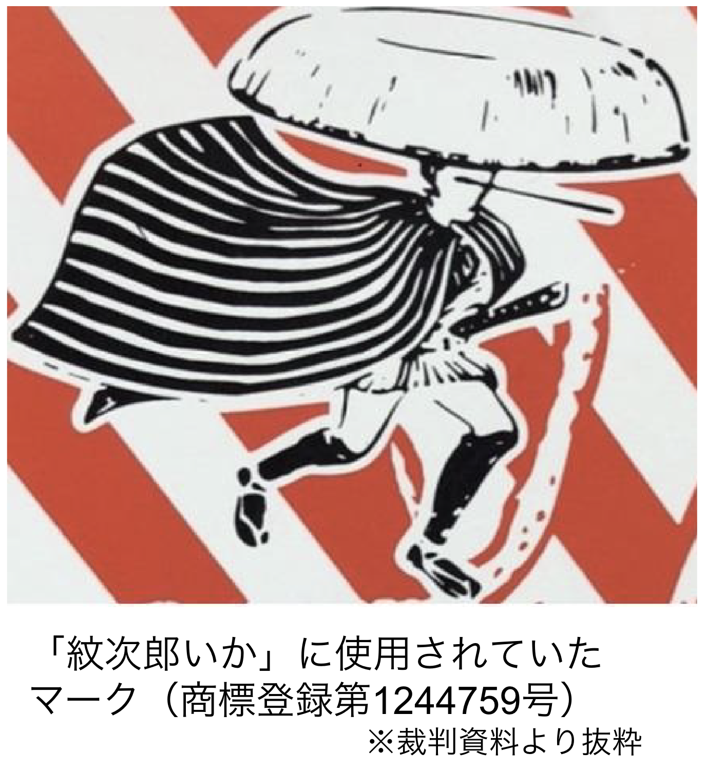 駄菓子屋などでは「紋次郎いか」を専用の容器に数十本程度入れ、1本ずつ取り出して販売することが多かったようですが、この容器には、ドラマの紋次郎と同じように三度笠をかぶり、長いカッパを羽織った「股旅姿」の人物を描いた手書きの画像が商品名と共に付けられていました。この手書きの人物像、及び「紋次郎」という名称は、それぞれ1970年代に商標登録もされ、現在も10年ごとの更新により商標権が存続しています。
