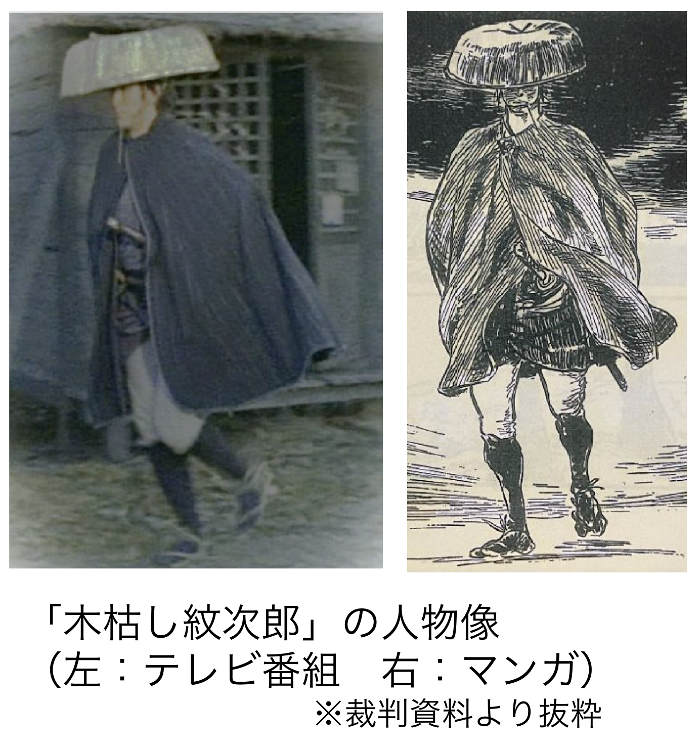 「木枯し紋次郎事件」の控訴審では、登録商標に使われた股旅姿の画像がテレビドラマの主人公と類似しているとされましたが、そもそも三度笠にカッパという昔の旅人のいでたちは、江戸時代の絵画にも描かれており、「独自に有している」特徴と言えるかどうかは微妙な感じがします。強いて言えば「長い楊枝をくわえている」のが特徴ということになるので、その辺りの評価が「類似性あり」という結論につながったかもしれません。